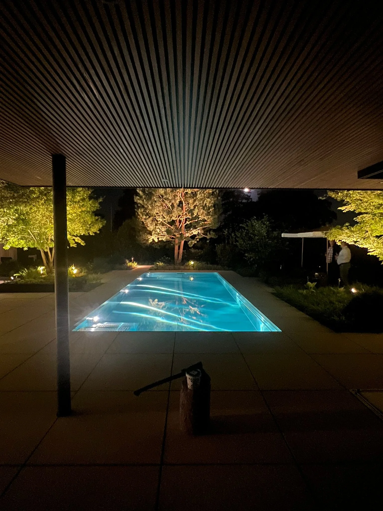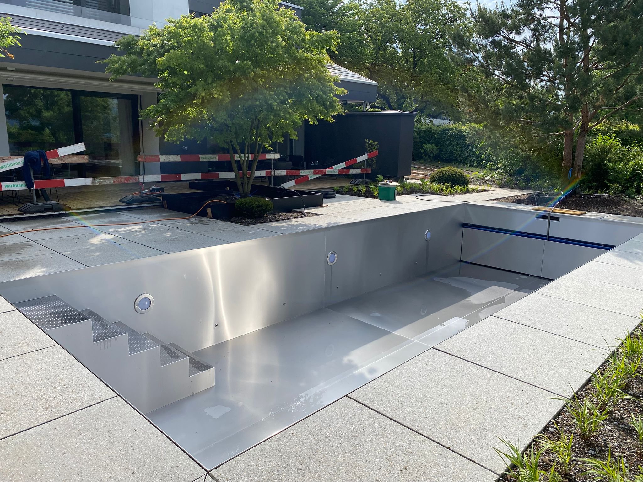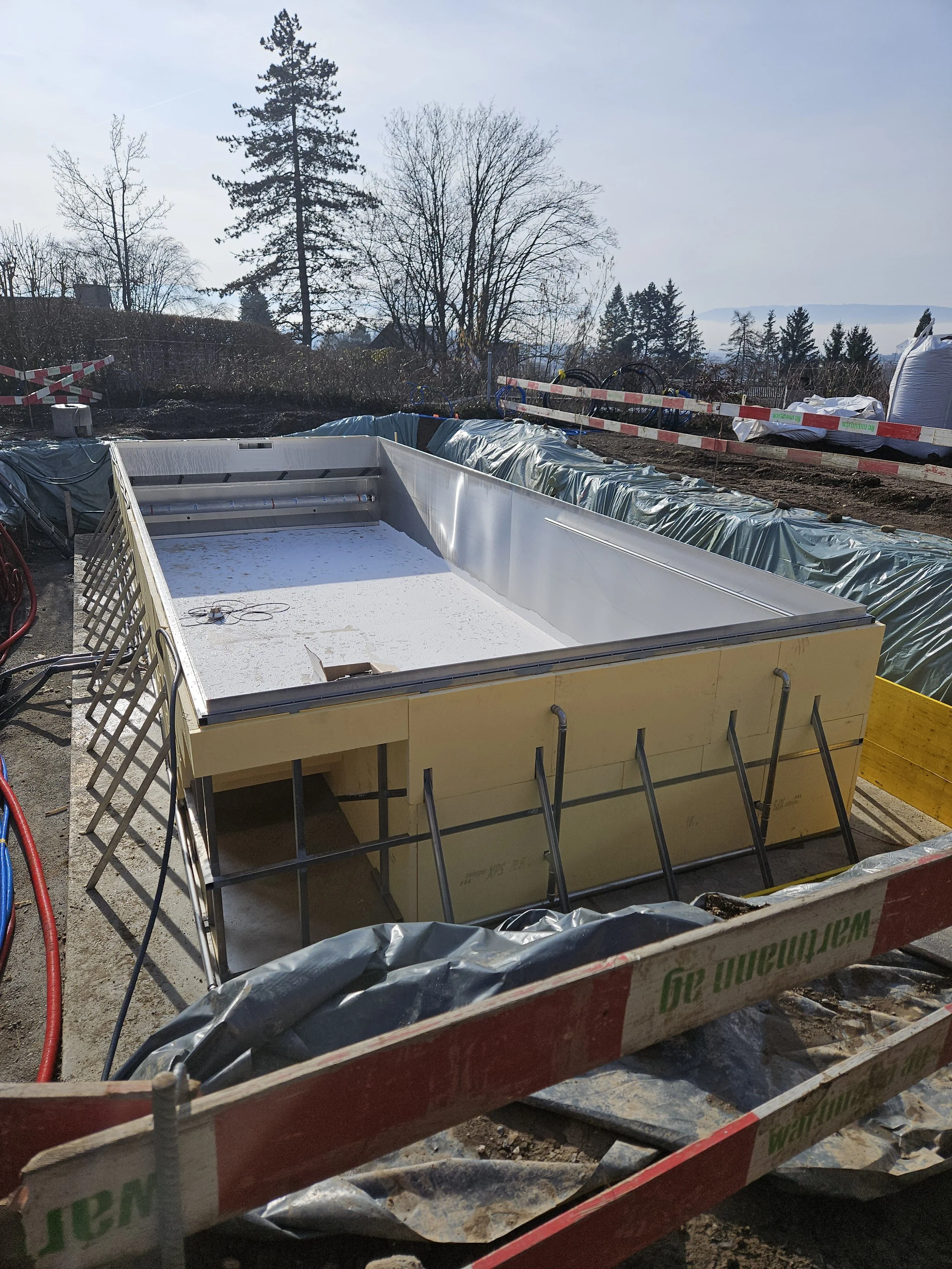 Im Jahr 2025 realisiertes Edelstahl-becken von KELLER Metallbautechnik AG, 8855 Wangen. Skimmer-Becken 10 x 4m, 1,5m tief. Drei Scheinwerfer LED PAR56, Warmweiss 3000K, 4'320 Lumen, 32 Watt. Rollladennische mit Frontblende als Beckenbodenverlängerung mit GRANDO-Rollladen Cap-tec, Polycarbonat Transluzent, zur Kindersicherheit mit Handlaufrohren. Fünfstufige Einstiegstreppe. Pooltechnik im Keller des Hauses, Pool beheizt ab der Haus-Wärmepumpe mittels Niedertemperatur-Wärmetauscher. Calplas-Filter mit Filterpumpe Badu PRIME 13. Mess- und Regelgerät Poolmanager 4 mit Flüssigchlor-Dosierung, umstellbar auf Aktivsauerstoff (Wasserstoffperoxid).