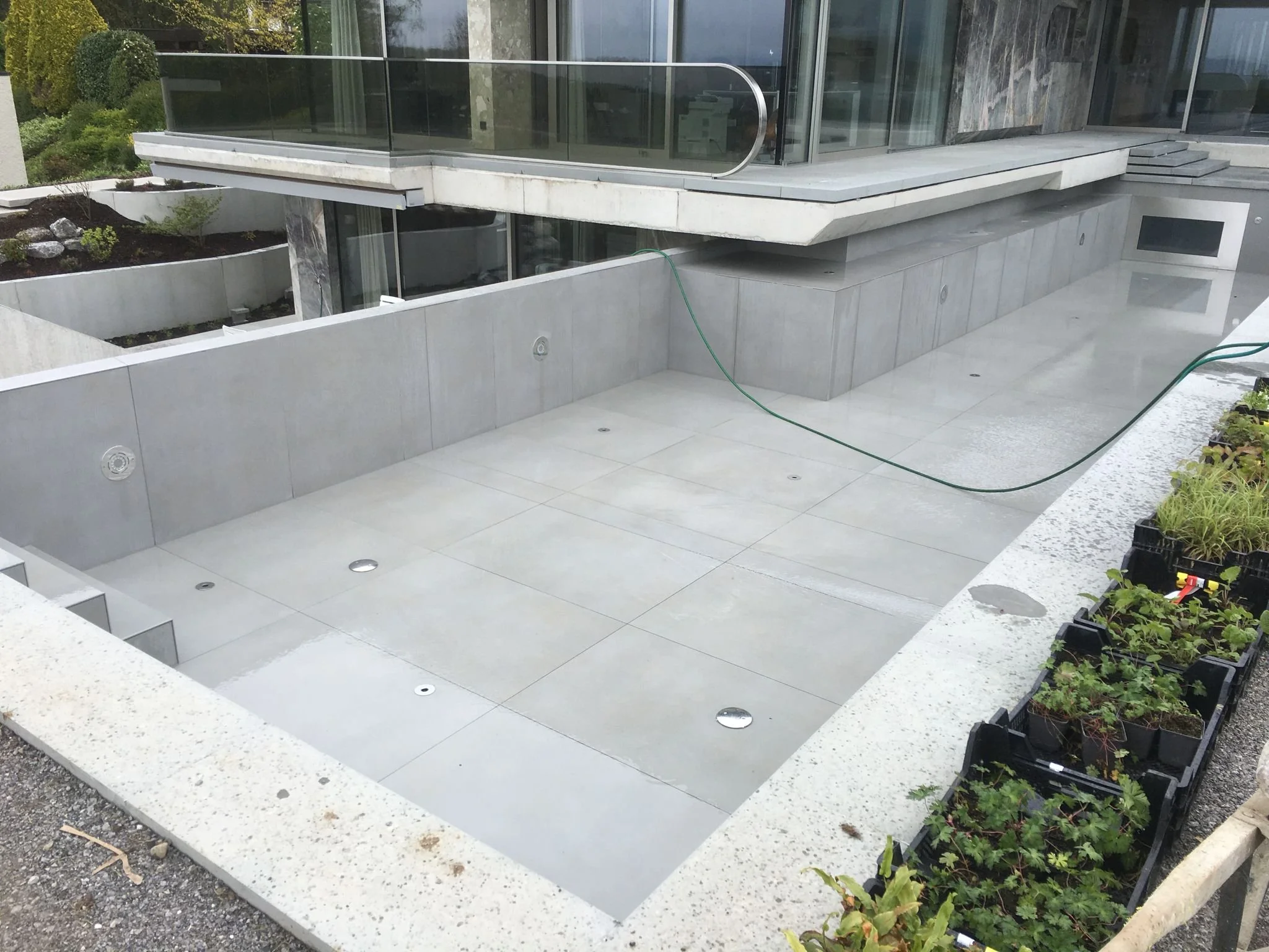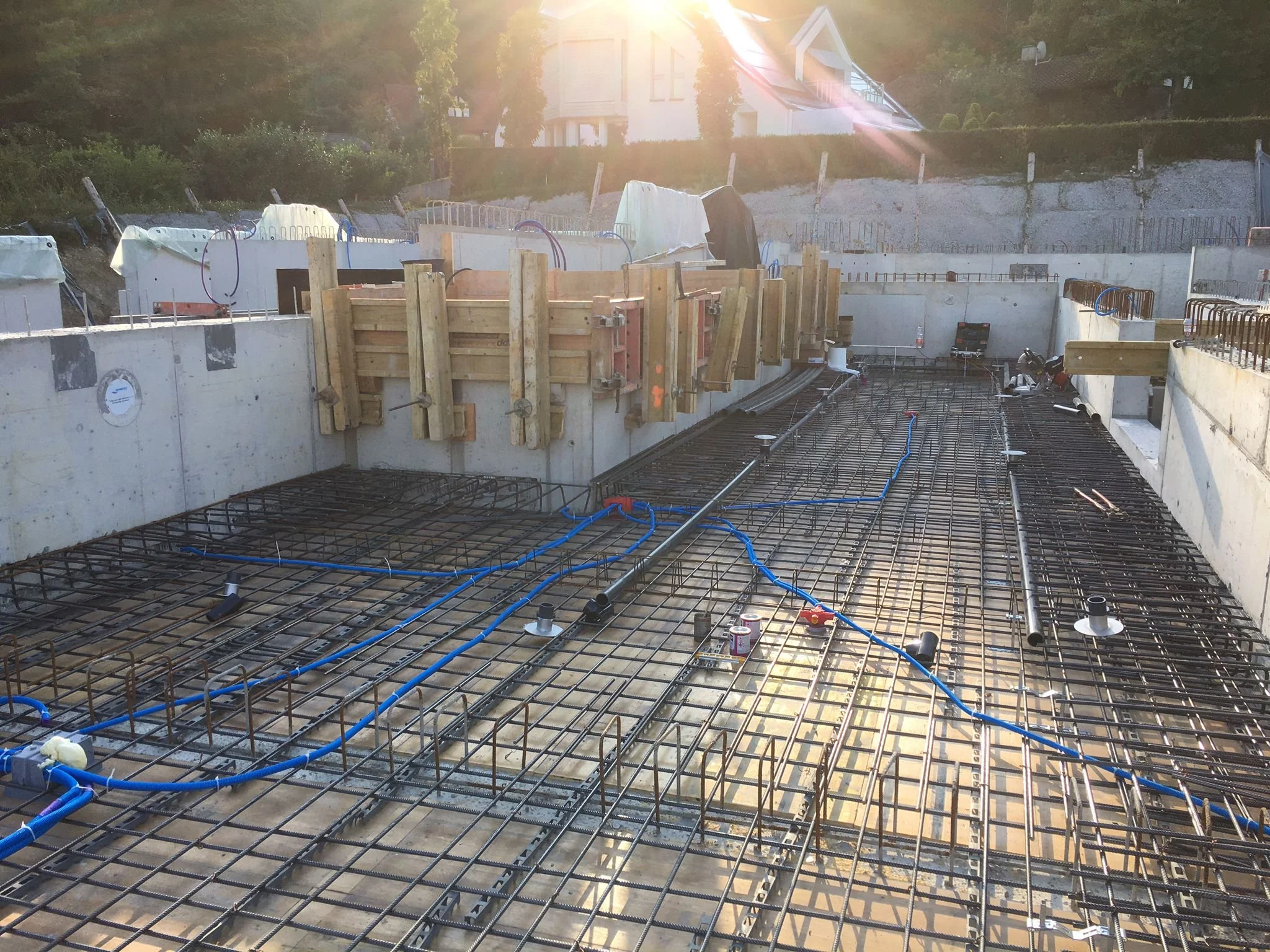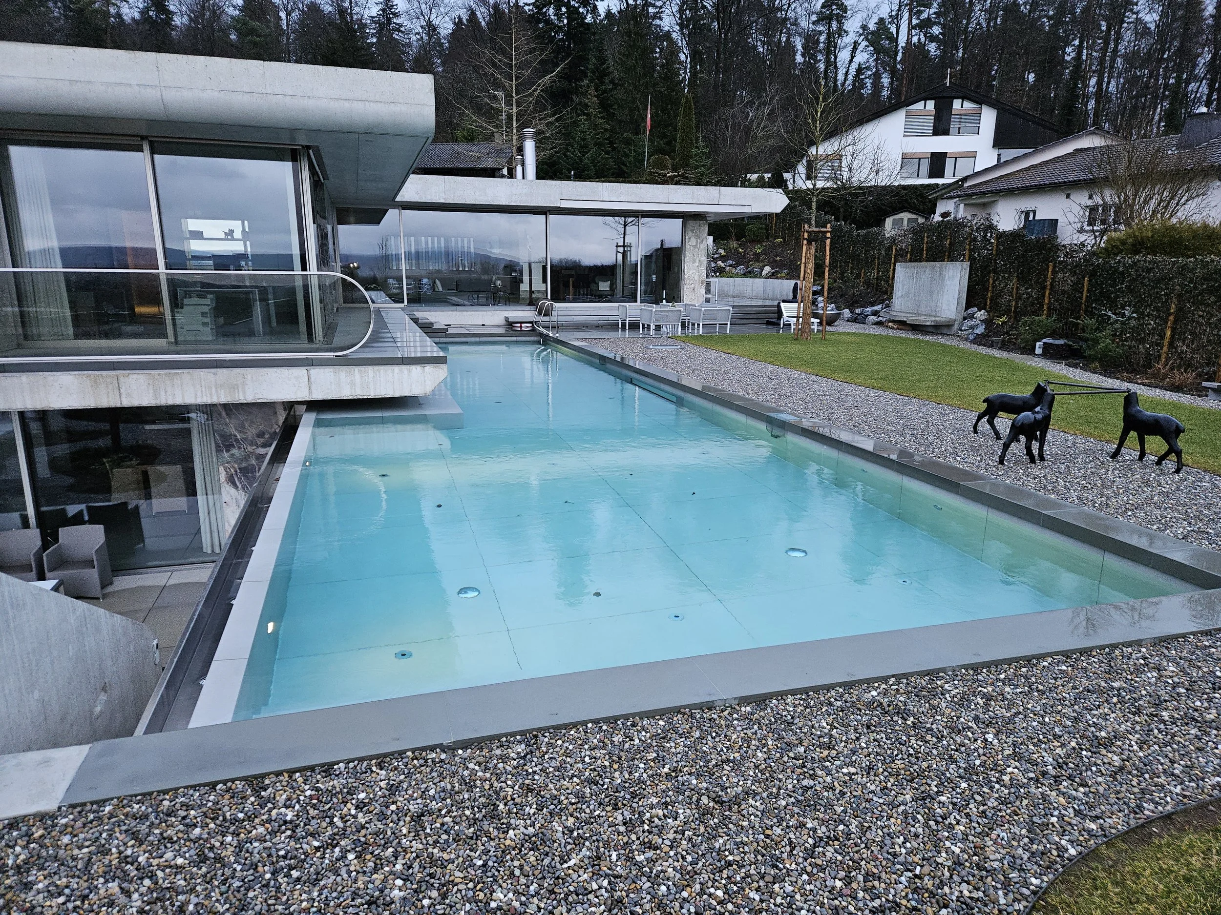 Im Jahr 2024 durch Preisig + Wasser AG, 8953 Dietikon erstelltes Beton-Becken mit Keramik-Auskleidung und angeflanschter, 9m langer INVINITY Edelstahl-Überlaufrinne. Beckengrösse : 17,78 x 5,01/3,34m, 1,2m tief. Mit zwei Wand-Fenstern, einer betonierten Einstiegstreppe und einer Edelstahl-Einstiegsleiter. Beleuchtung mit vier EVA Optics Scheinwerfern A12, Warmweiss, 40Watt. Mittelschicht-Filter CALPLAS mit Schichthöhe 950mm, Filterpumpe frequenzgesteuert mit Badu DELTA-MK 27, dichtungslose Pumpe OHNE Gleitringdichtung. Besgo-Rückspül- und Umstellventil auf Bodenablauf. Zwei Laubfänger aus Edelstahl beim bauseitig betonierten Sammelbehälter. Chlorfreie Ozon-Badewasseraufbereitung HYDROZON mit Plasma-Ozonerzeuger POX 30/20S, Ozonmenge 30g/h.
