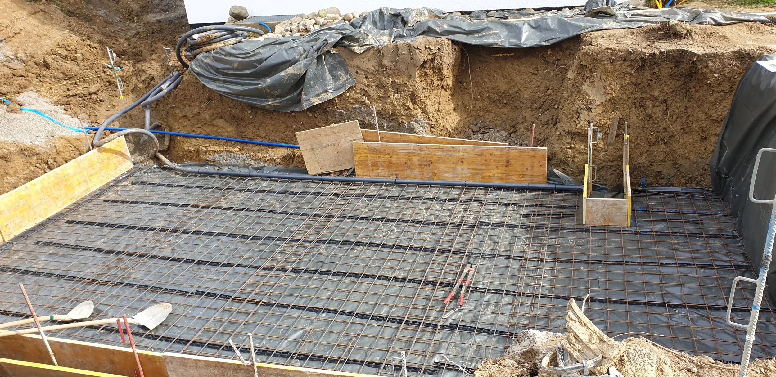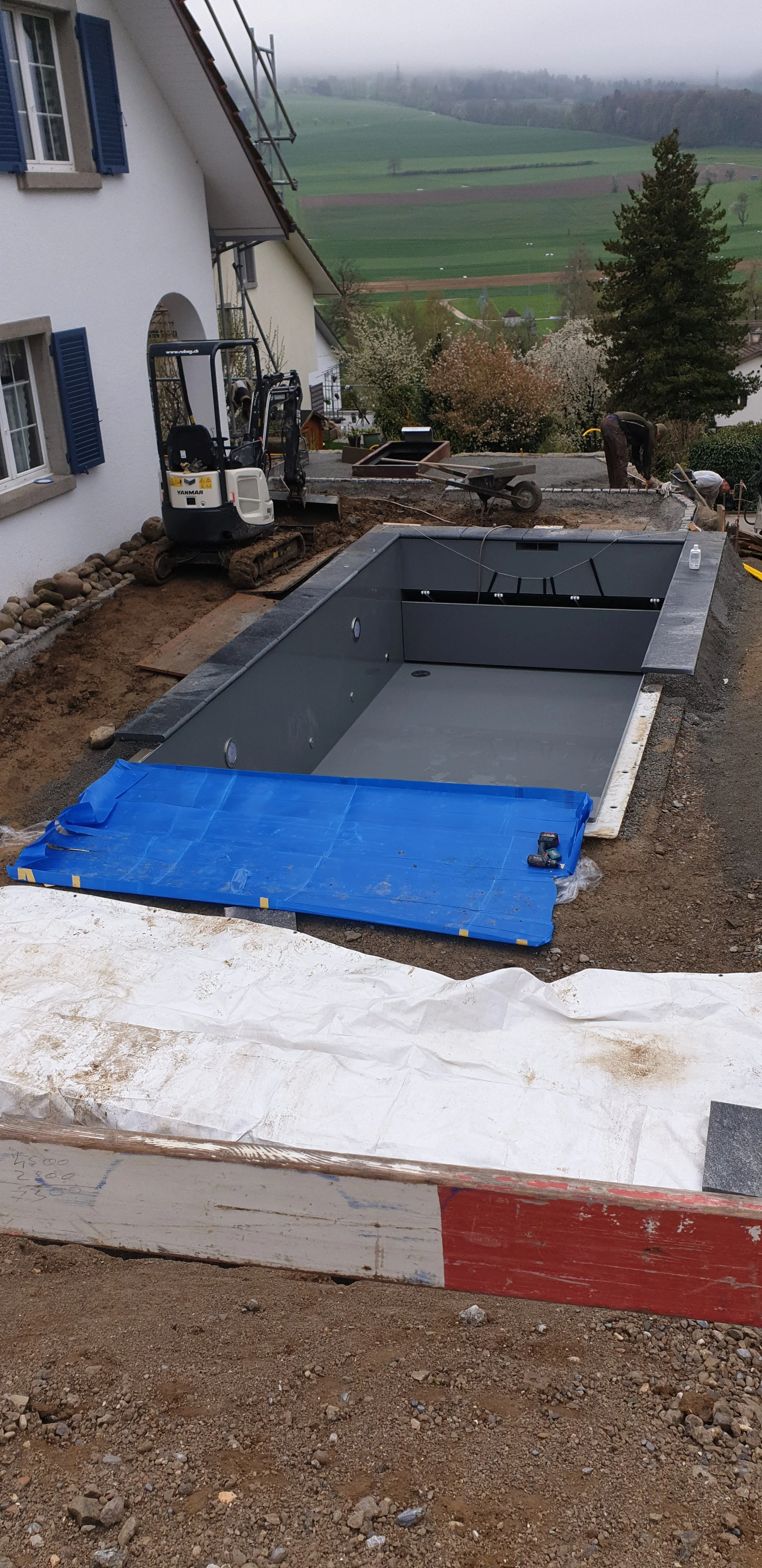 Im Jahr 2023 mit dem Kunden realisiertem Skimmer-Fertigbecken aus Polypropylen des tschechischen Herstellers NIVEKO, Grösse 6,5 x 3,2m, 1,50m tief. Mit Treppenanlage über die ganze Beckenbreite und gegenüberliegender Rollladennische mit Frontblende in Beckenbodenverlängerung. Rollladen AquaDeck PVC grau mit Rohrmotor. Filteranlage CALPLAS mit 6-Wege Umstellventil und Filterpumpe Badu PRIME 11. Beheizung des Pools ab Photovoltaikanlage mit Elektroheizung RedLine Plus 6,0kW.